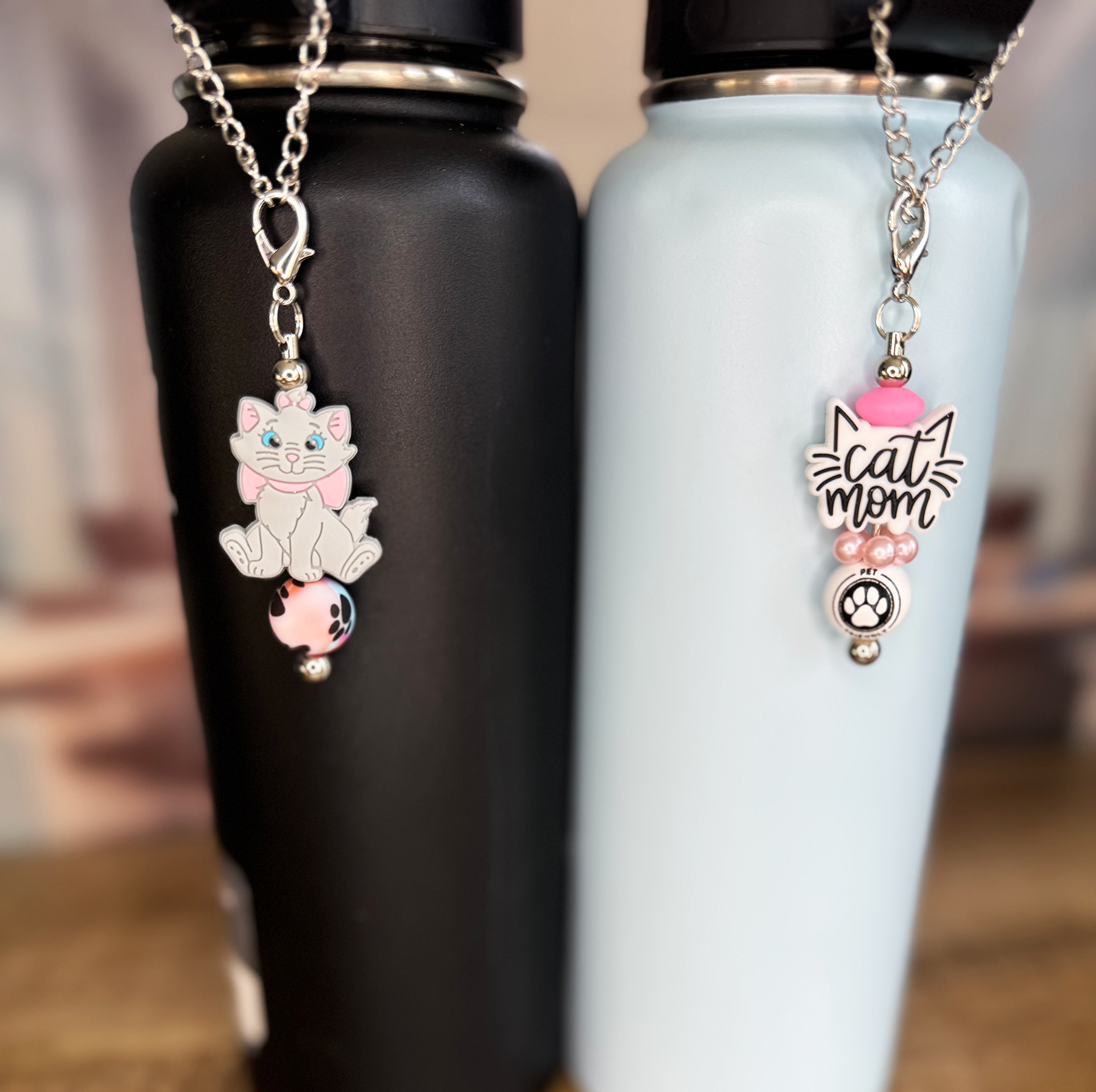 -Beadbable Bottle (Stanley Cup) Chain Kits include a durable chain base with an adjustable link design made to fit a variety of tumblers and bottles, plus two coordinating charms.