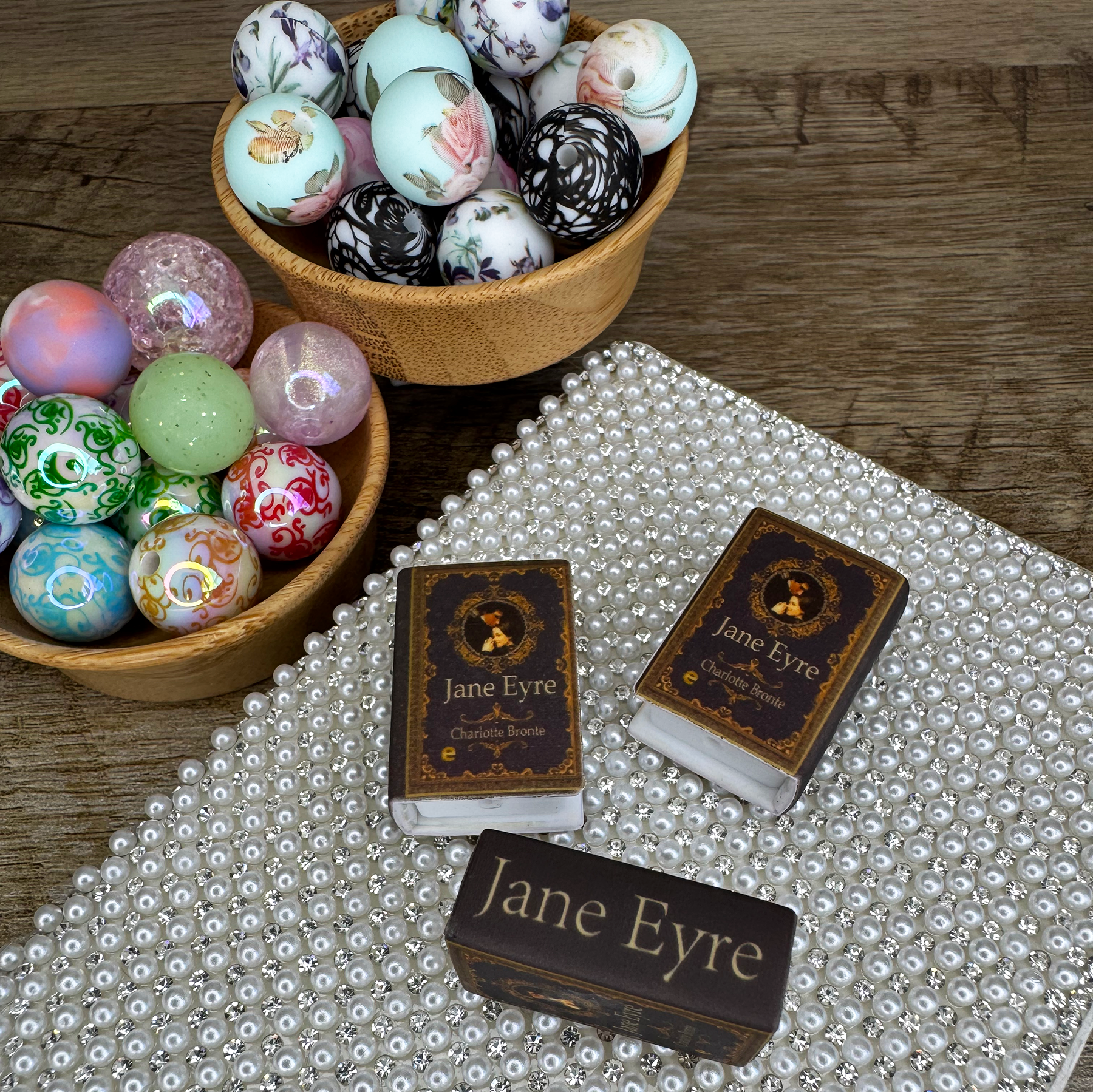 This kit includes a themed bead pack featuring over 10 beads, including an iconic book-inspired focal bead depicting a beloved literary classic, along with coordinating lace, floral, vine and color accent beads.