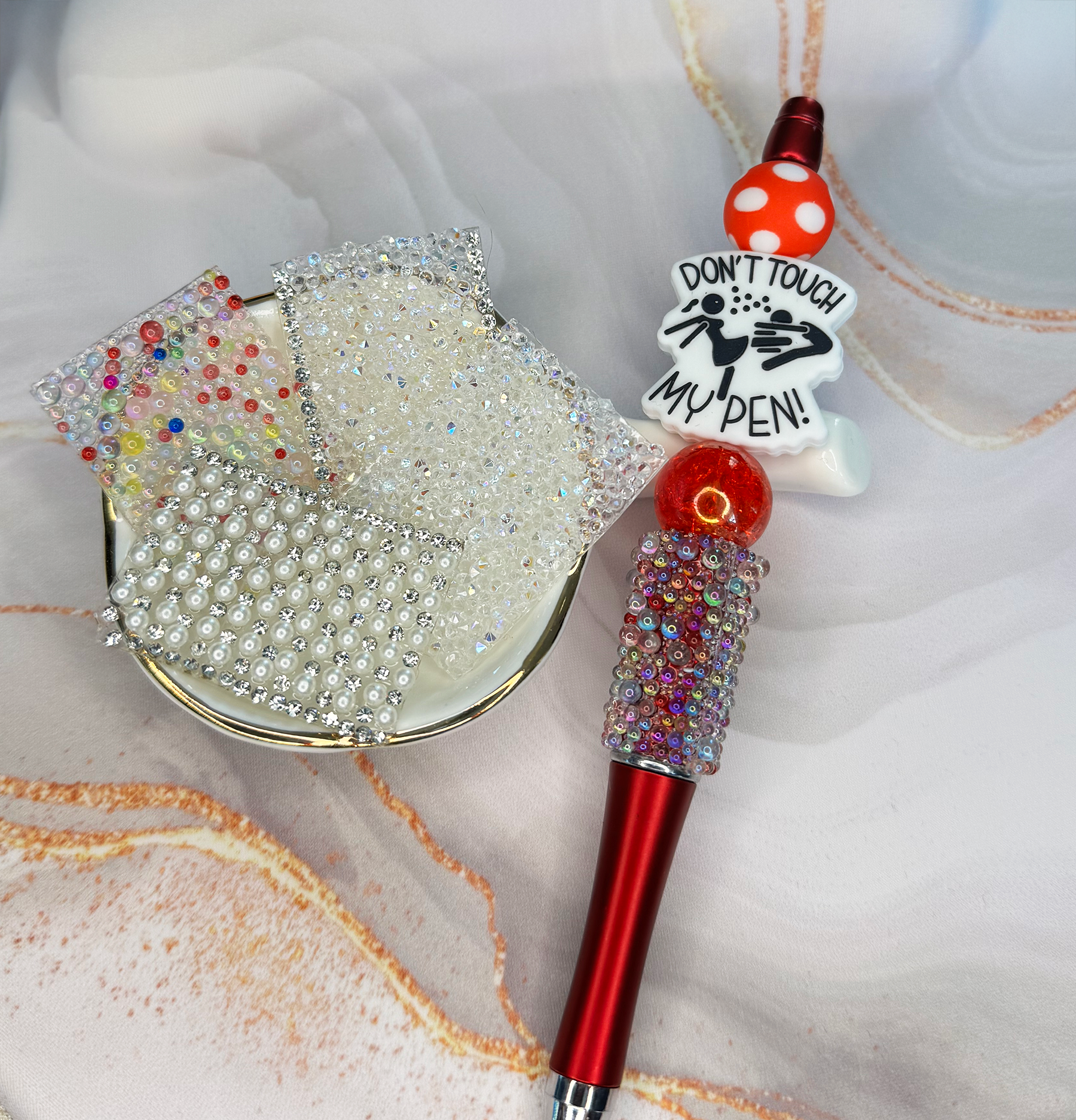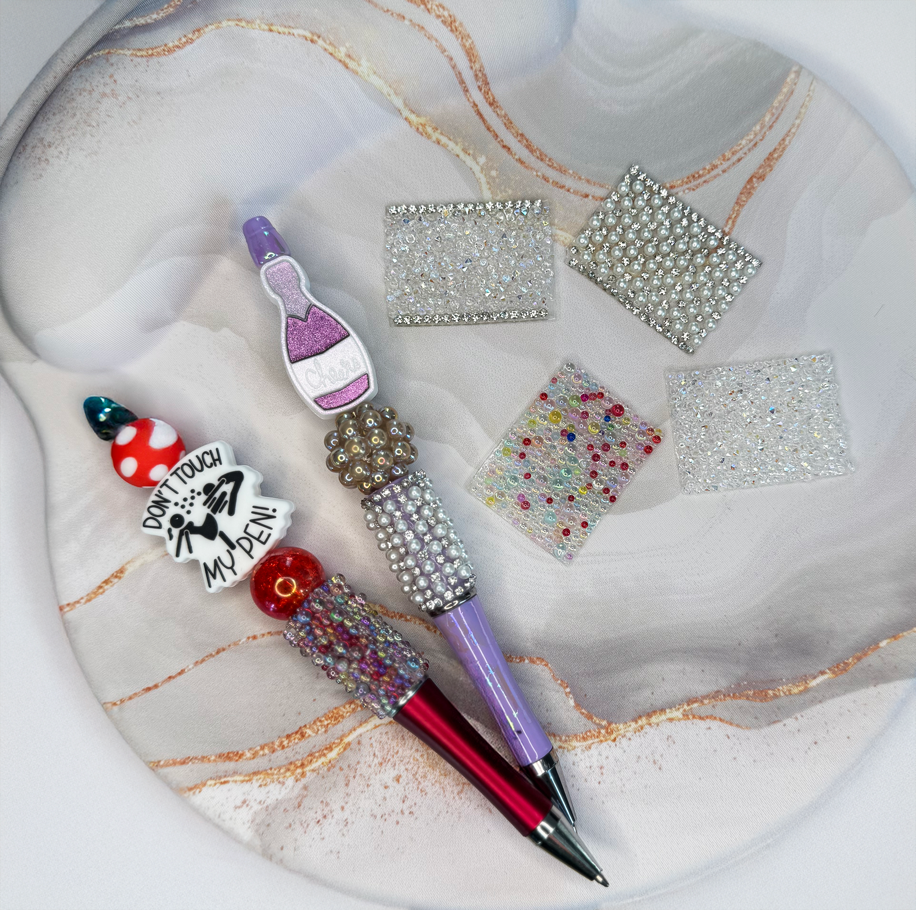Give your beadable pens an instant glow-up with our Beadable Pen Wraps! This set includes 4 dazzling wraps—two in crushed crystal, one in rhinestone & pearl, and one in a whimsical rainbow gem design. (PEN BASE NOT INCLUDED)